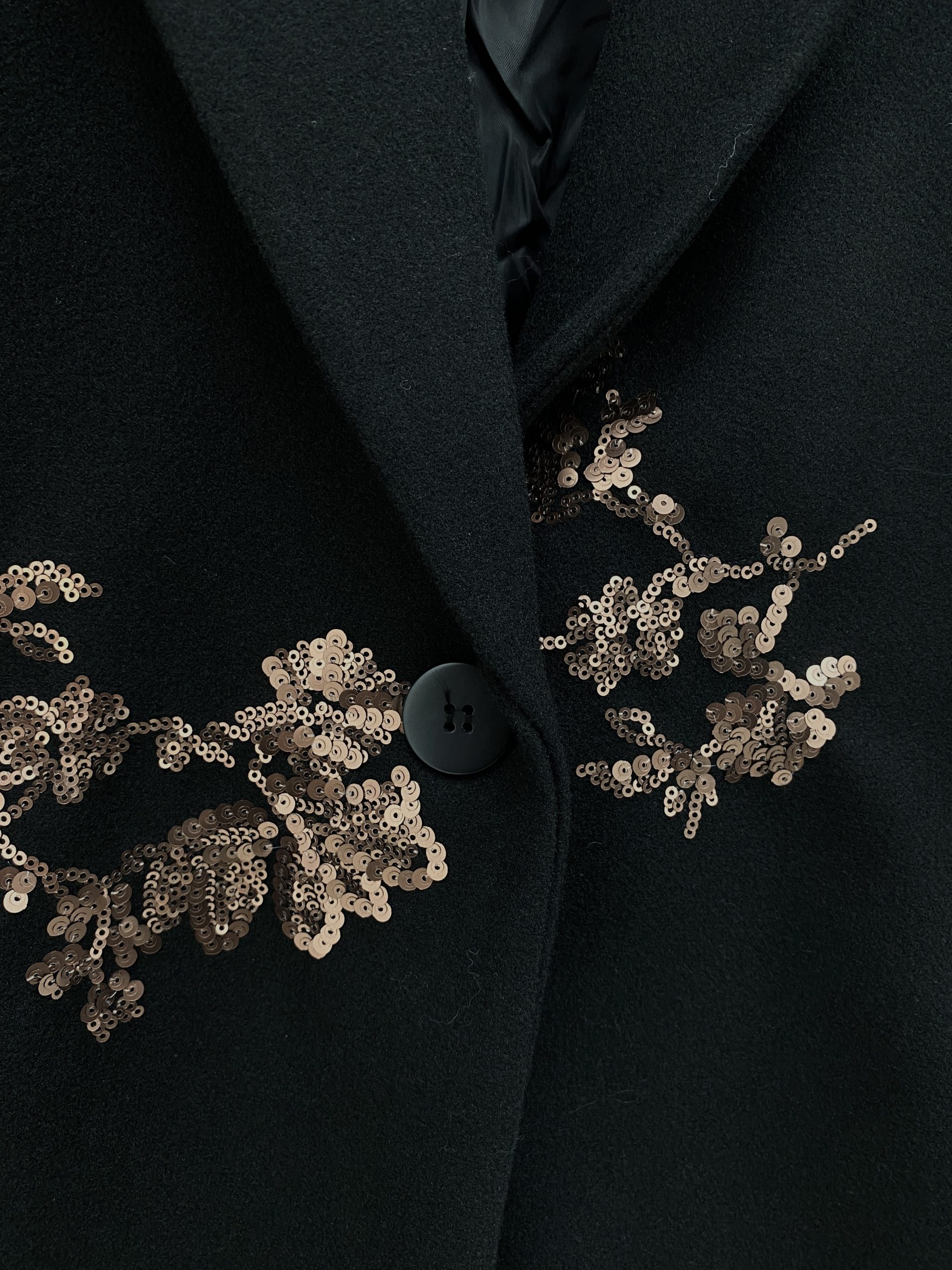 BLAZER DE PAÑO FORRADA, CON DETALLES DE LENTEJUELAS.