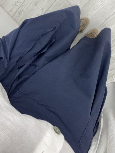 PANTALÓN EFECTO PISTACHO, CON BOLSILLOS, GOMA EN LA CINTURA.