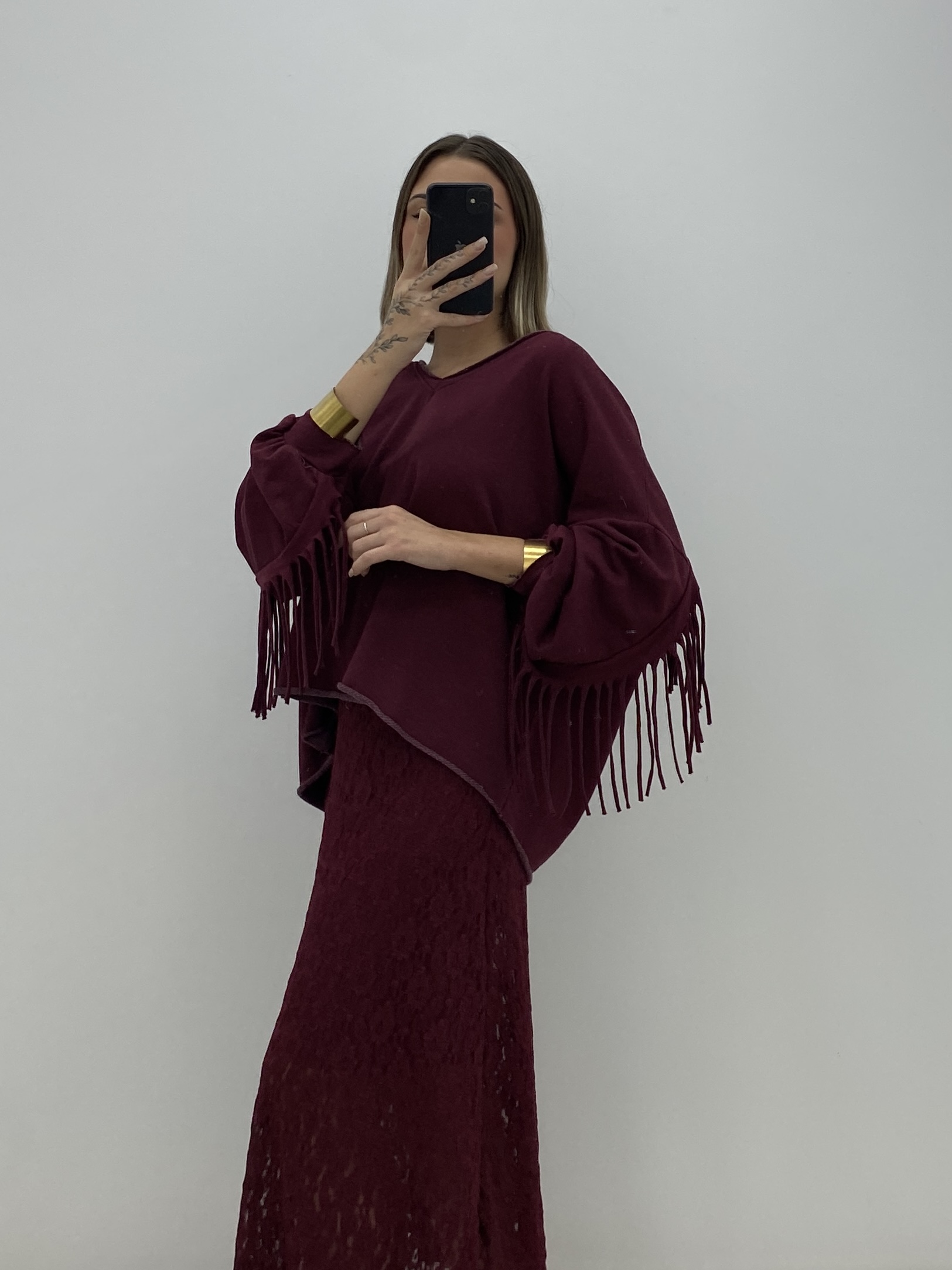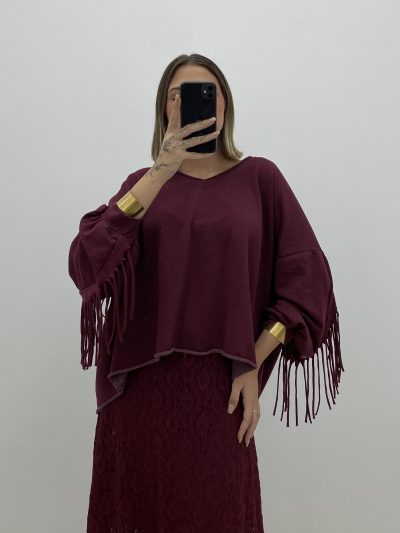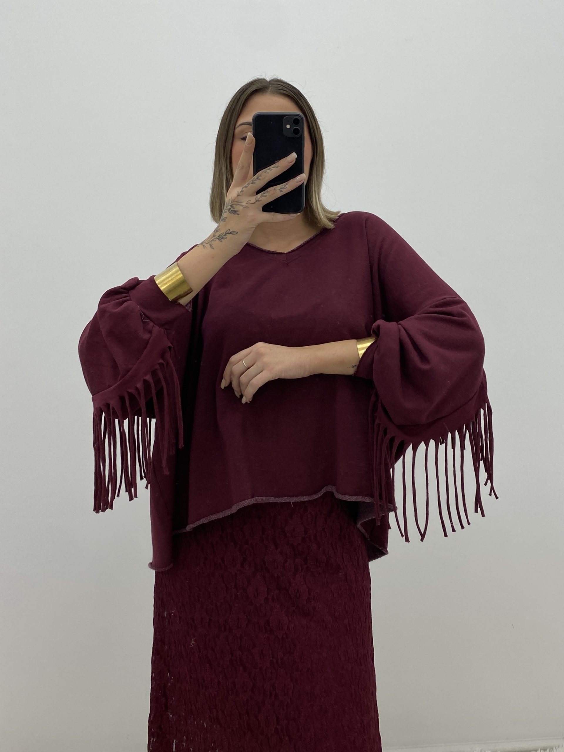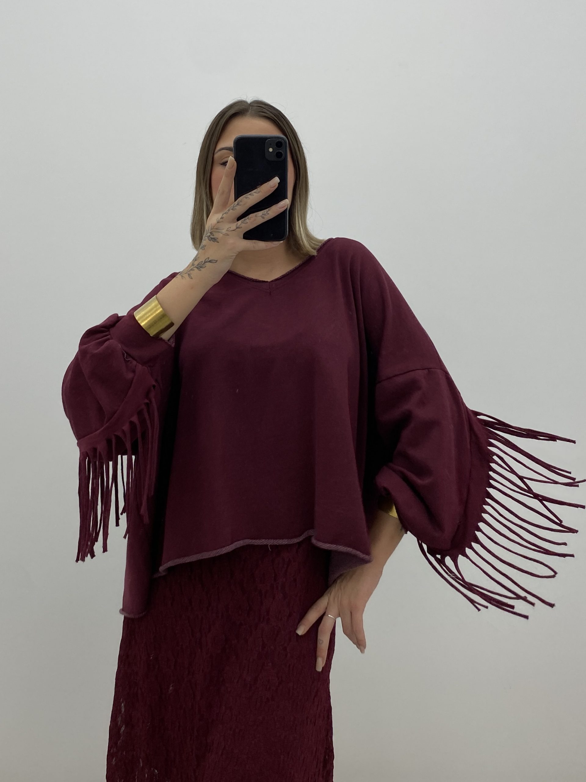 SUDADERA OVERSIZE, CON DETALLE DE FLECOS, COMBINABLE EN VARIOS ESTILOS.
